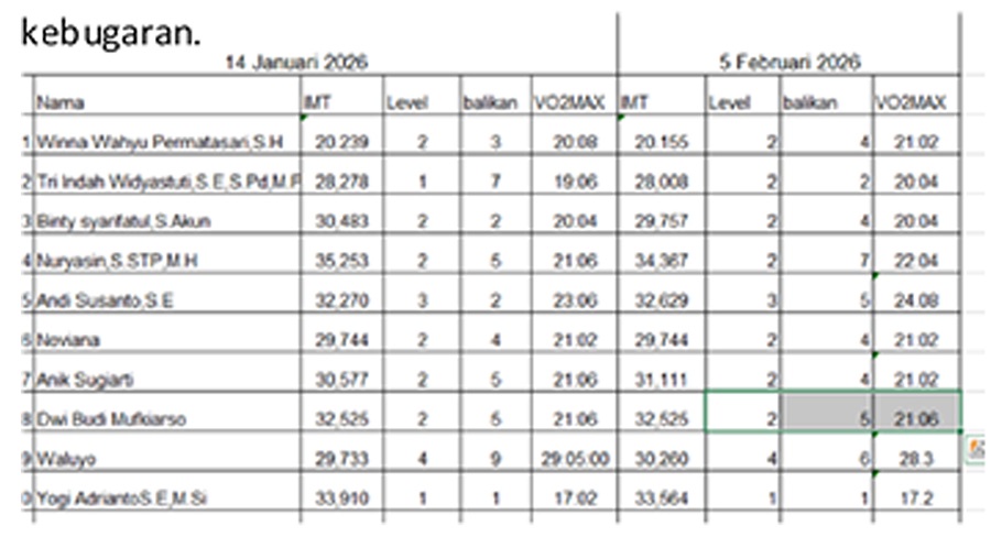 tubuh ASN. Hasil pemantauan kebugaran menunjukkan bahwa Oleh karena itu, diperlukan kebijakan strategis sebagian ASN berada pada kategori overweight hingga yang mampu menjaga kebugaran fisik dan mental obesitas berdasarkan indikator Indeks Massa Tubuh (IMT). ASN agar tetap produktif dalam mendukung Selain itu, kapasitas kardiorespirasi yang diukur melalui keberhasilan transformasi digital pemerintahan. indikator VO₂Max juga menunjukkan nilai yang relatif rendah.