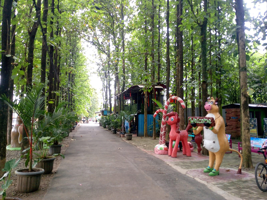 Area seluas 4,5 hektar ini suasananya adem banget, lho! Dipenuhi pohon jati dan pepohonan rindang, tempat duduk yang nyaman, bikin betah siapa saja untuk bersantai. Nah, karena areanya luas banget, nggak mungkin dong dijelajahi jalan kaki saja? Tenang, pengelola sudah menyediakan transportasi gratis untuk berkeliling.